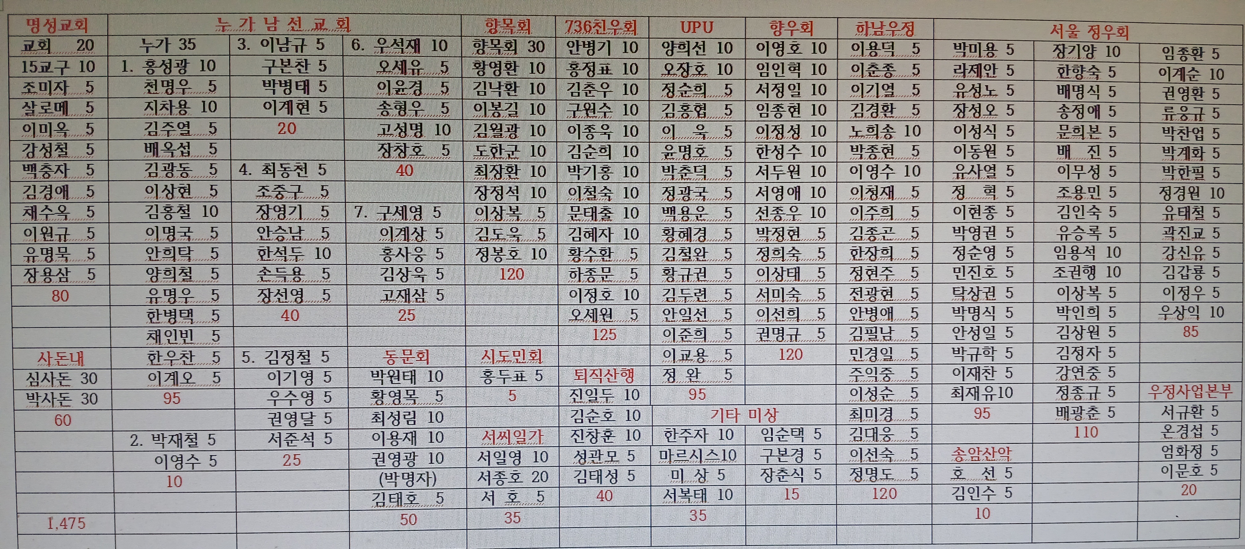 모친상에 경조금 현황(10/30 현재)